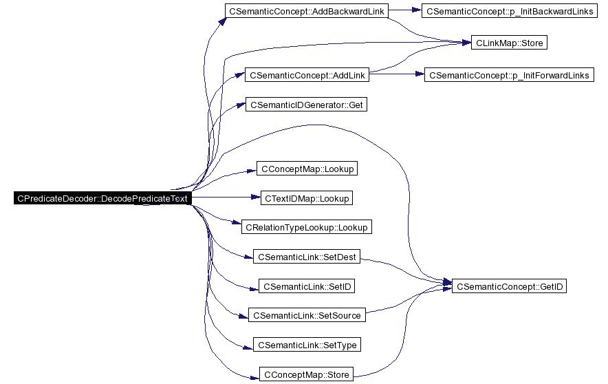 Definition at line 43 of file pred_decoder.h. References CSemanticConcept::AddBackwardLink(), CSemanticConcept::AddLink(), DPRINT, CSemanticIDGenerator::Get(), CSemanticConcept::GetID(), CConceptMap::Lookup(), CTextIDMap::Lookup(), CRelationTypeLookup::Lookup(), m_relationLookup, RelationType, SemanticID, CSemanticLink::SetDest(), CSemanticLink::SetID(), CSemanticLink::SetSource(), CSemanticLink::SetType(), CLinkMap::Store(), and CConceptMap::Store(). Referenced by COMCSNet::LoadPredicateFile(). |